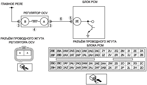 • Короткое замыкание на цепь питания в проводном жгуте между контактом А OCV и контактом 2E блока PCM
